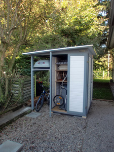 Kinderkrippen und Kindergärten in Großstädten haben oft ein Platzproblem bei der Unterbringung Ihrer Spielsachen im Außenbereich. Oftmals stehen nur kleine Grünflächen zu Verfügung. So auch eine Münchner Kinderkrippe mit Sitz in einem modernen Gewerbegebiet. Sie haben sich für einen Garten[Q]pure entschieden. Er wird jetzt zur Garage von diversen Bobby-Cars, Dreirädern, Sandspielzeug und Besen. Durch seine Wartungsfreiheit brauch niemand den Garten[Q] regelmäßig streichen. Er nimmt kaum Spiel-Platz weg und passt sich außerdem extrem gut an seiner modernen Umgebung an.
