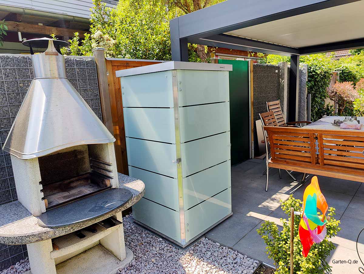 ![. The image shows a close-up of a modern garden storage unit or shed, likely made of metal and wood panels. It is labeled "Garten[Q]" on the top edge. The structure has a sleek, contemporary design with horizontal paneling, and it is located outdoors with some greenery visible in the background.](assets/images/a/design-Gartenhaus-hpl-b79b1c96.jpg)