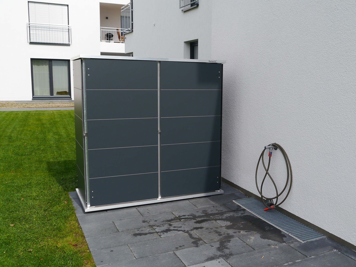 Auf Wunsch können Sie auch eine Sockelkonstruktion mit farbigen Trespa-Blenden wählen. Sie erhöht das Außenmaß um ca. 10 cm.