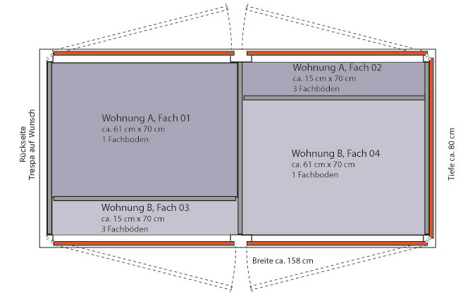 An einer schmalen Seite (80 cm) ist standardmäßig eine braune, kunststoffbeschichtete Holzplatte eingesetzt. Sollte Ihr Share frei stehen, können Sie diese Seite mit einer Trespa-Platte gemäß Türfarbe und Design verkleiden.